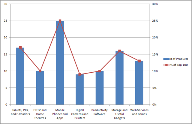 The top 100 by product category (total and % of Top 100) breaks down as shown below between Tablets, PC and E-Readers, HDTV and Home Theatres, Mobile Phones and Apps, Digital Cameras and Printers, Productivity Software, Storage and Useful Gadgets, and Web Services and Games.